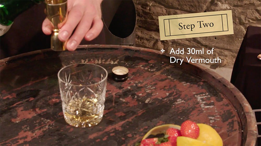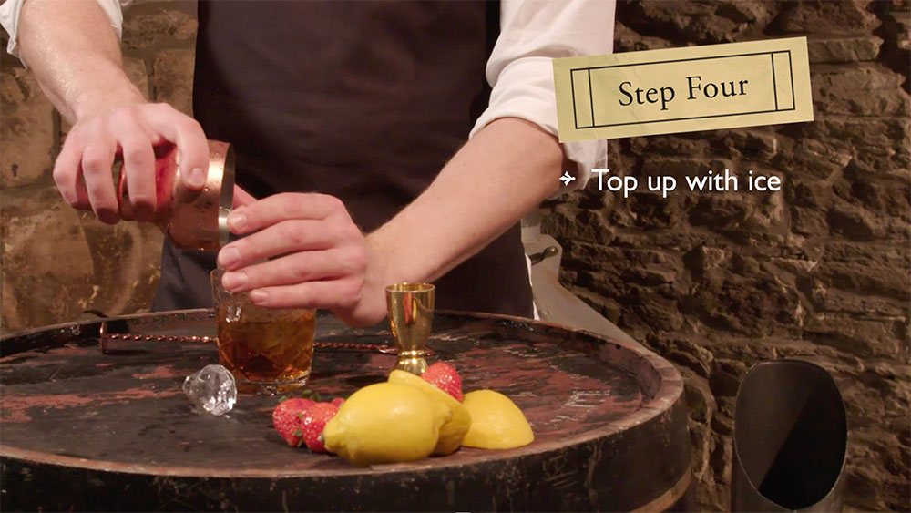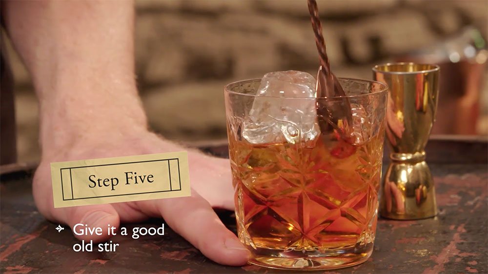 2. Add cubed ice and stir. Don’t over dilute – this drink is best chilled but not sub-zero. 30 – 40 times for this drink is a good rule of thumbs (so 30 – 40 stirs)