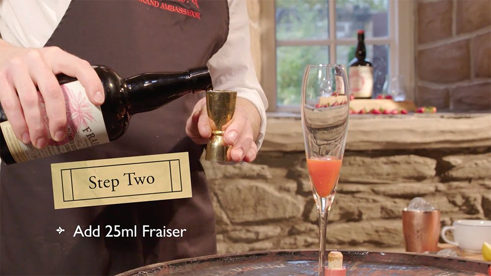 1. Add Fraiser, strawberry puree and a splash of prosecco to mixing tin or glass and stir gently with bar spoon. Just enough for bubbles to diminish.