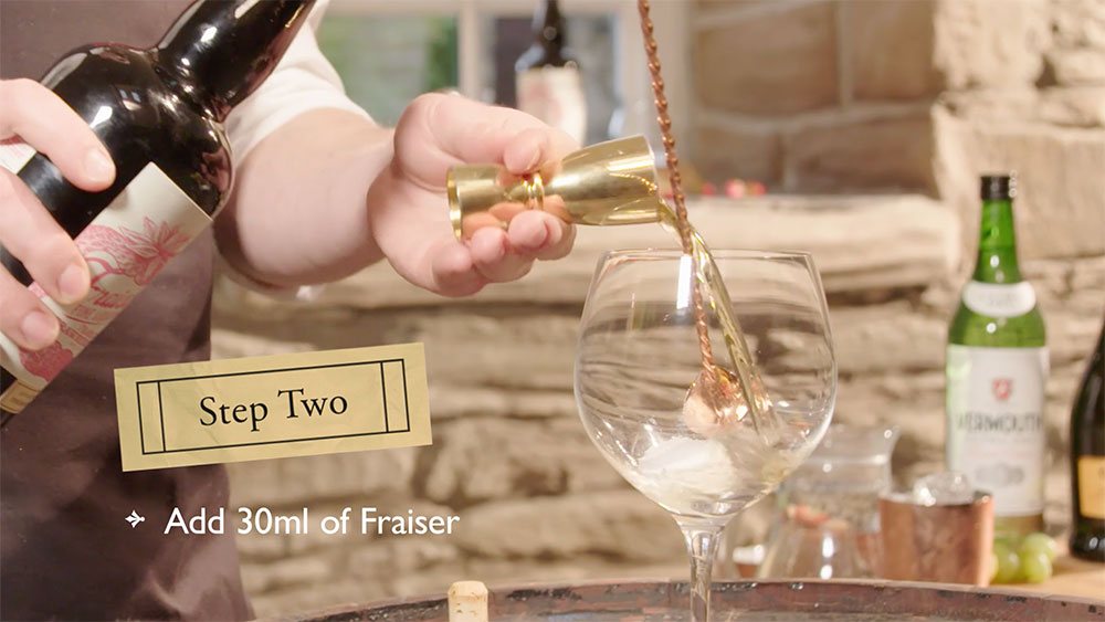 2. Add Fraiser, Sugar and Vermouth (or Sherry) into the wine glass.