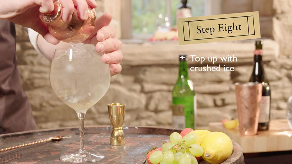 6. If you have crushed ice then add this now. It should fill the gap left from the cubed ice to just over the lip of the glass.